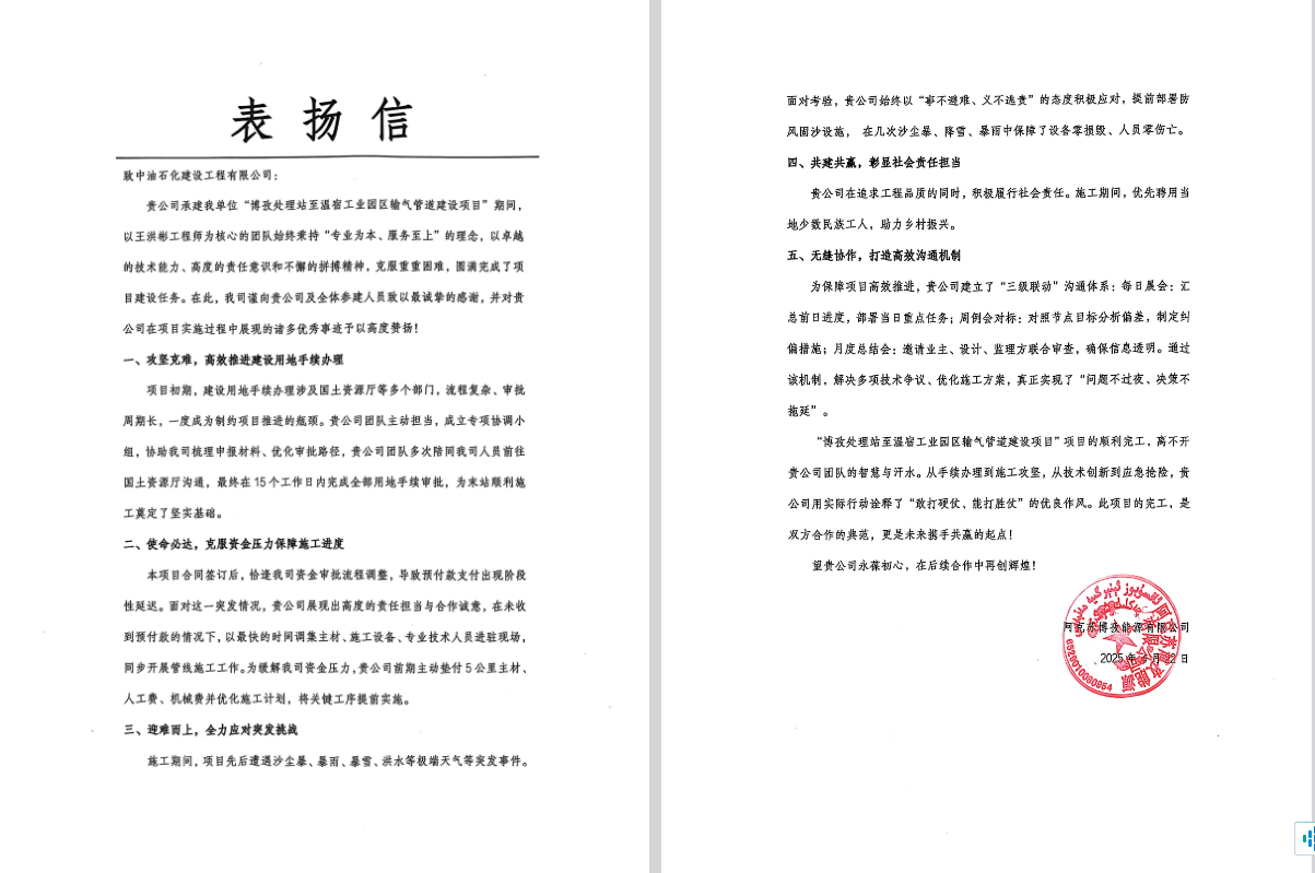 貴公司承建我單位“博孜處理站至溫宿工業(yè)園區(qū)輸氣管道建設(shè)項目”期間,以王洪彬工程師為核心的團隊始終秉持“專業(yè)為本、服務(wù)至上”的理念,以卓越的技術(shù)能力、高度的責(zé)任意識和不懈的拼搏精神,克服重重困難,圓滿完成了項目建設(shè)任務(wù)。在此,我司謹(jǐn)向責(zé)公司及全體參建人員致以最誠摯的感謝,并對貴公司在項目實施過程中展現(xiàn)的諸多優(yōu)秀事跡予以高度贊揚!