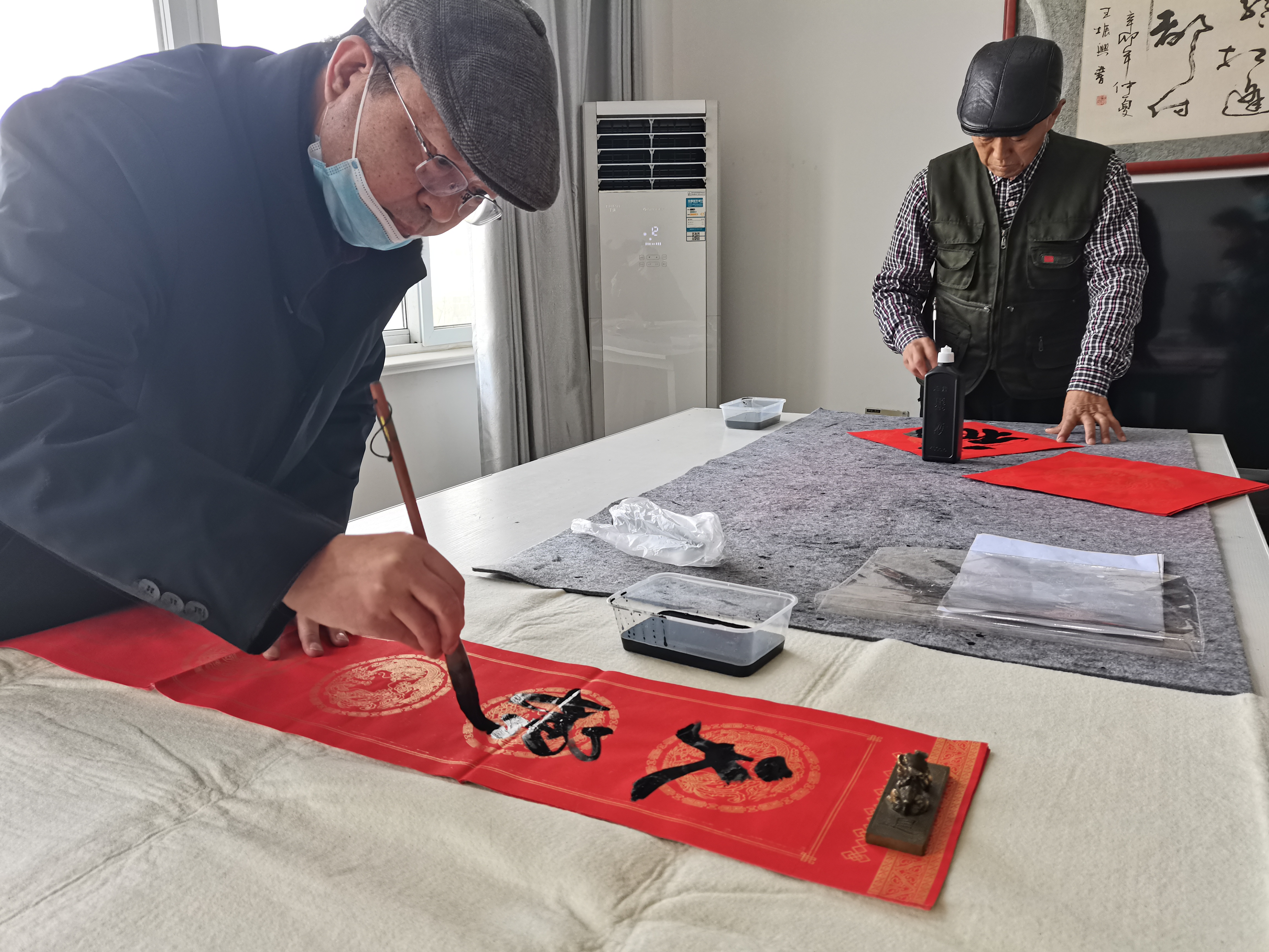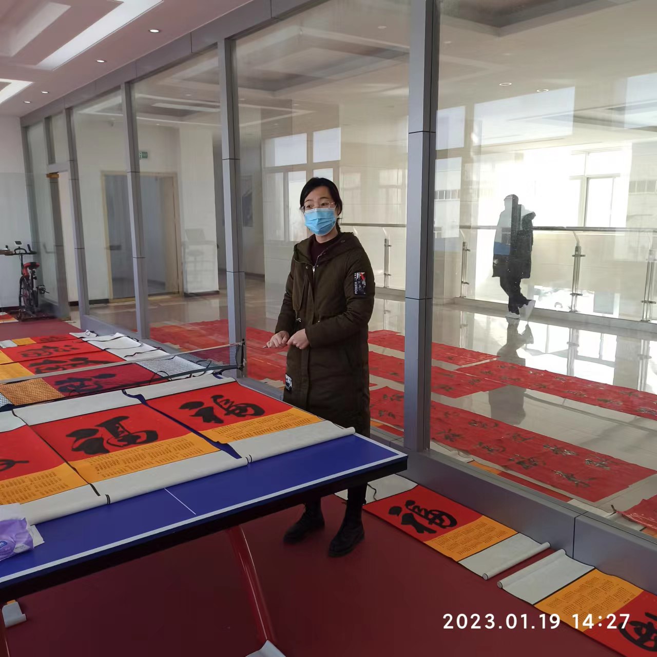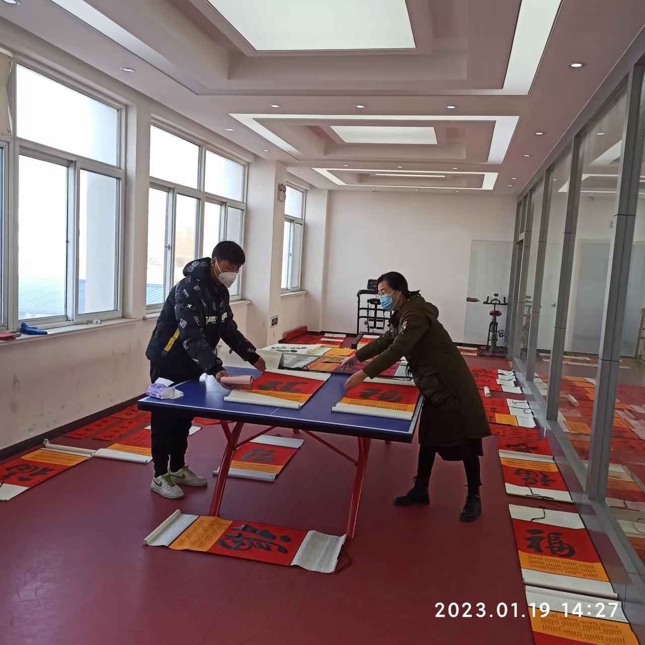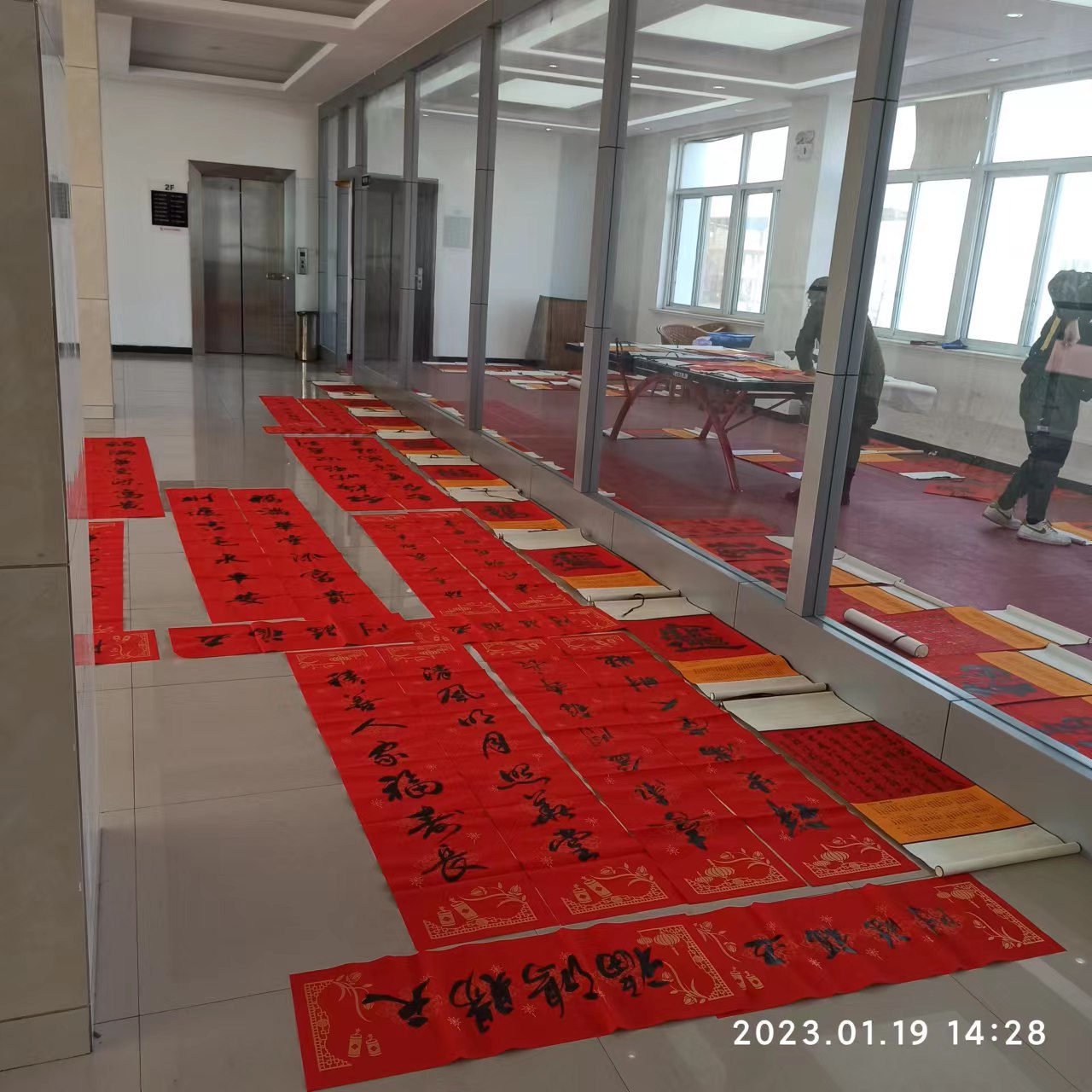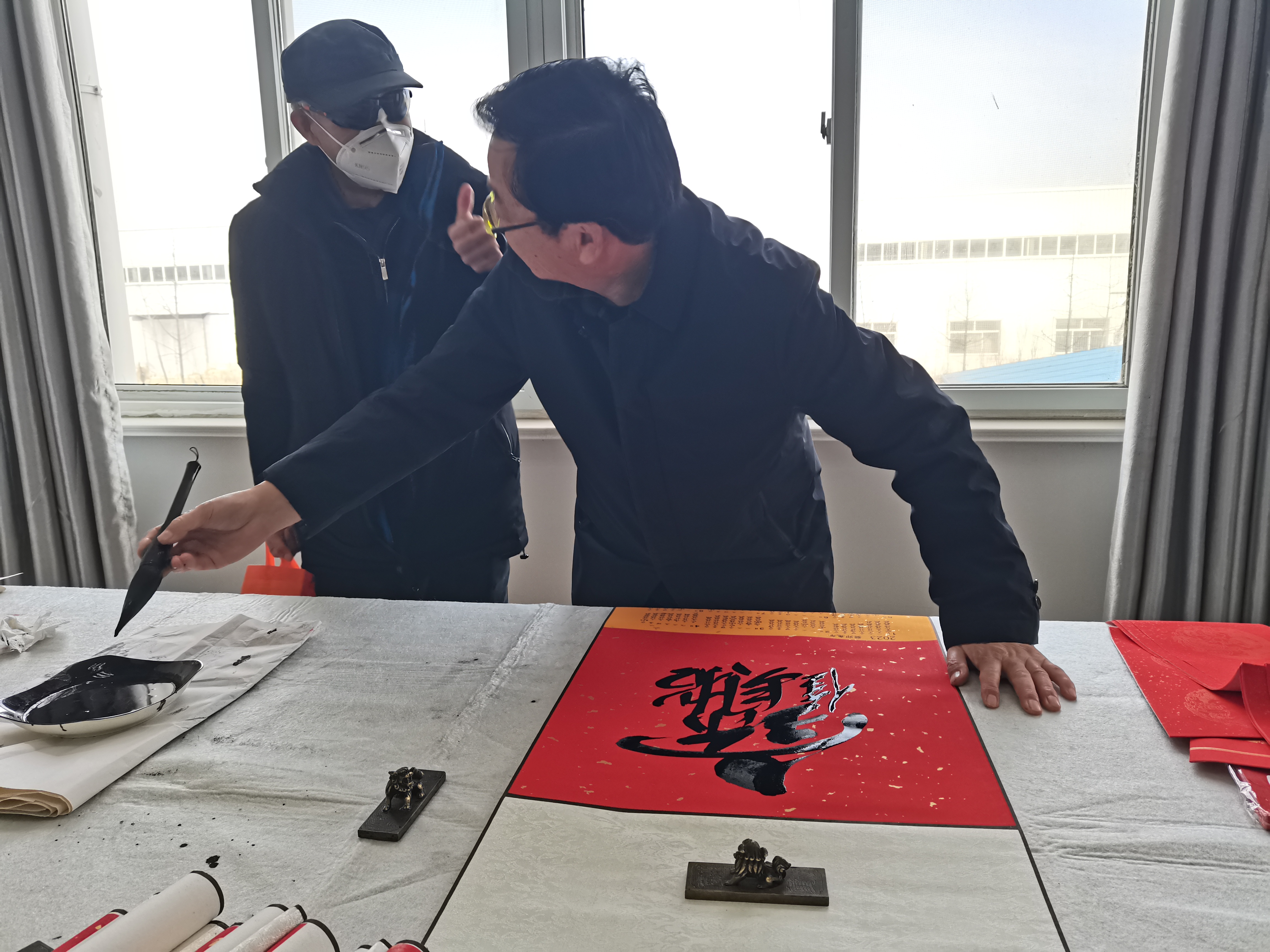 23年1月19日,公司邀請市書協(xié)數(shù)個會員到公司書寫春聯(lián),并對公司書法愛好者進行了交流指導活動?;顒又泄咎崆皽蕚淞舜郝?lián)卷軸、對聯(lián)紅紙、筆墨等材料。書法家在現(xiàn)場書寫“?!弊值葤旒?20余件,對聯(lián)80副。各種對聯(lián)等作品,由公司統(tǒng)一發(fā)放到各個部門,整個活動井然有序,氣氛和諧歡快。